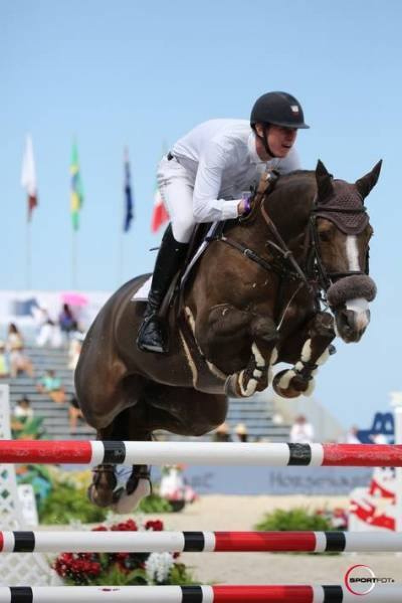 Triomphe de Muze nakomeling , Casper de Muze op 1 in de 1m50 proef op de CSI3* in Birmingham onder het zadel van Guy Williams (GBR).